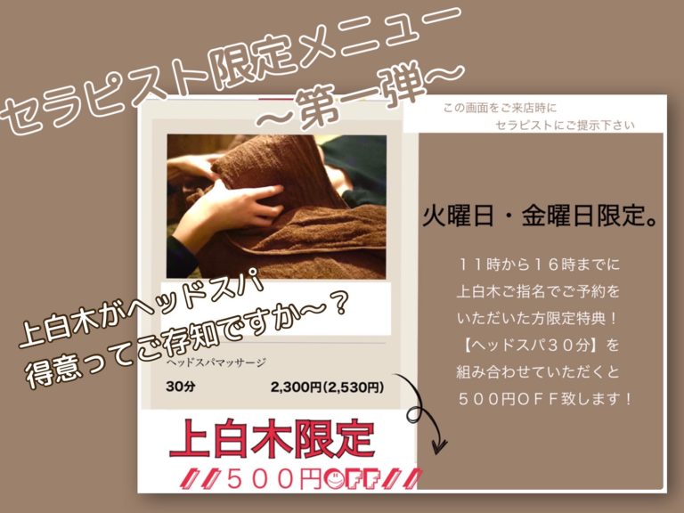 💛セラピスト限定メニュー祭り♪【上白木編】💛