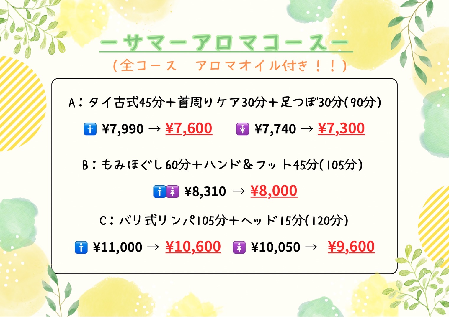 サマーアロマA:タイ45分+首回り30分+足つぼ15分+アロマつき