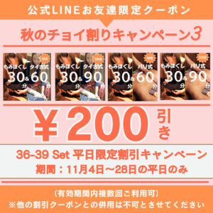 ★公式LINEお友達限定:11月平日割引クーポンを配信(11/1より)します
