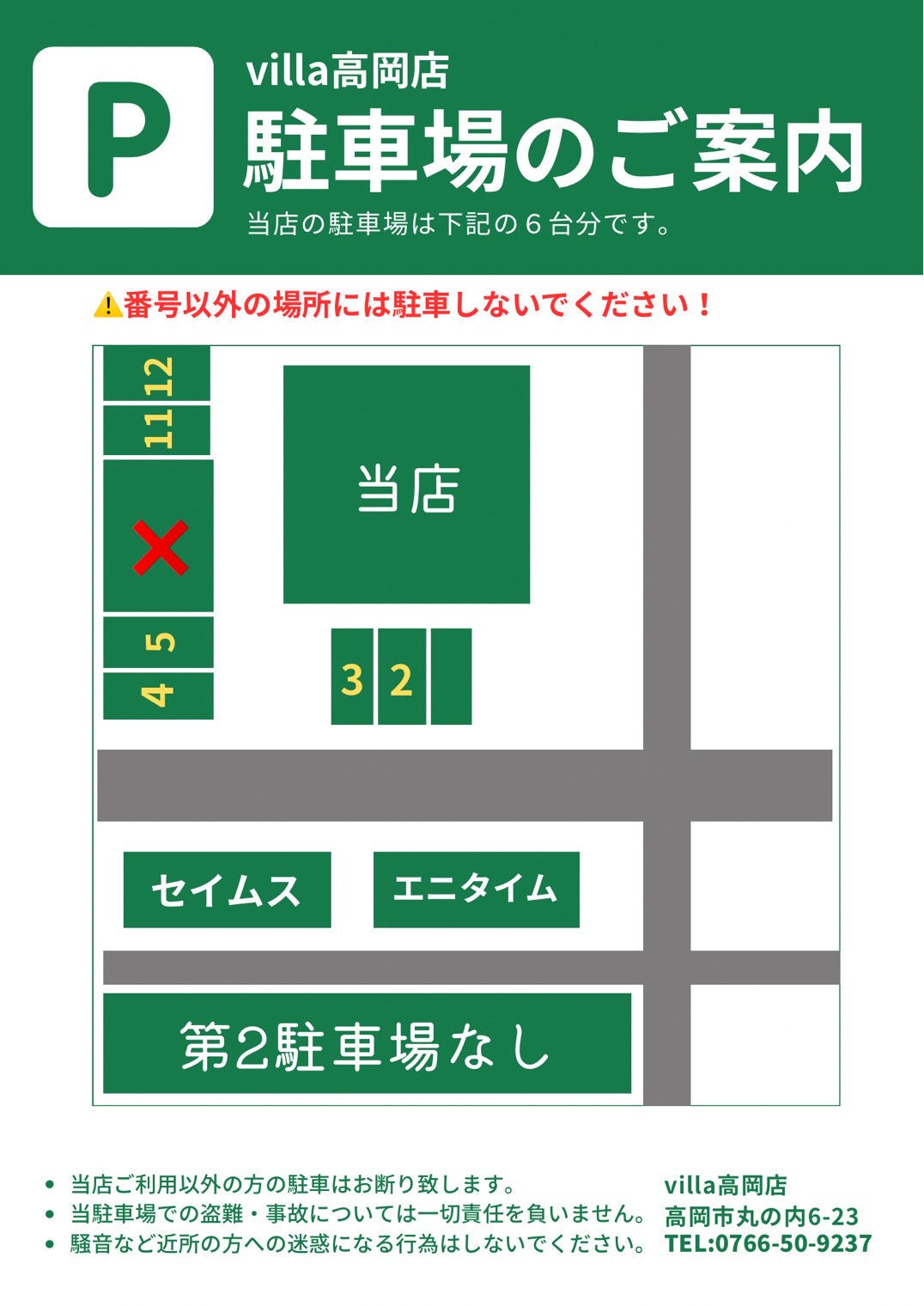 当店の駐車場は店舗の前と横の2、3、4、5、11、12番です。