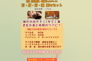 • 9月特価キャンペーン『 目・肩・首・頭 楽々セット』タイ古式 60分 + ヘッドスパ 60分 + アジアンハーブホットアイマスク付き🌺