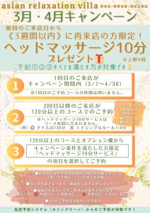 【3-4月キャンペーン条件を満たした方限定「ヘッドマッサージ10分サービス」】