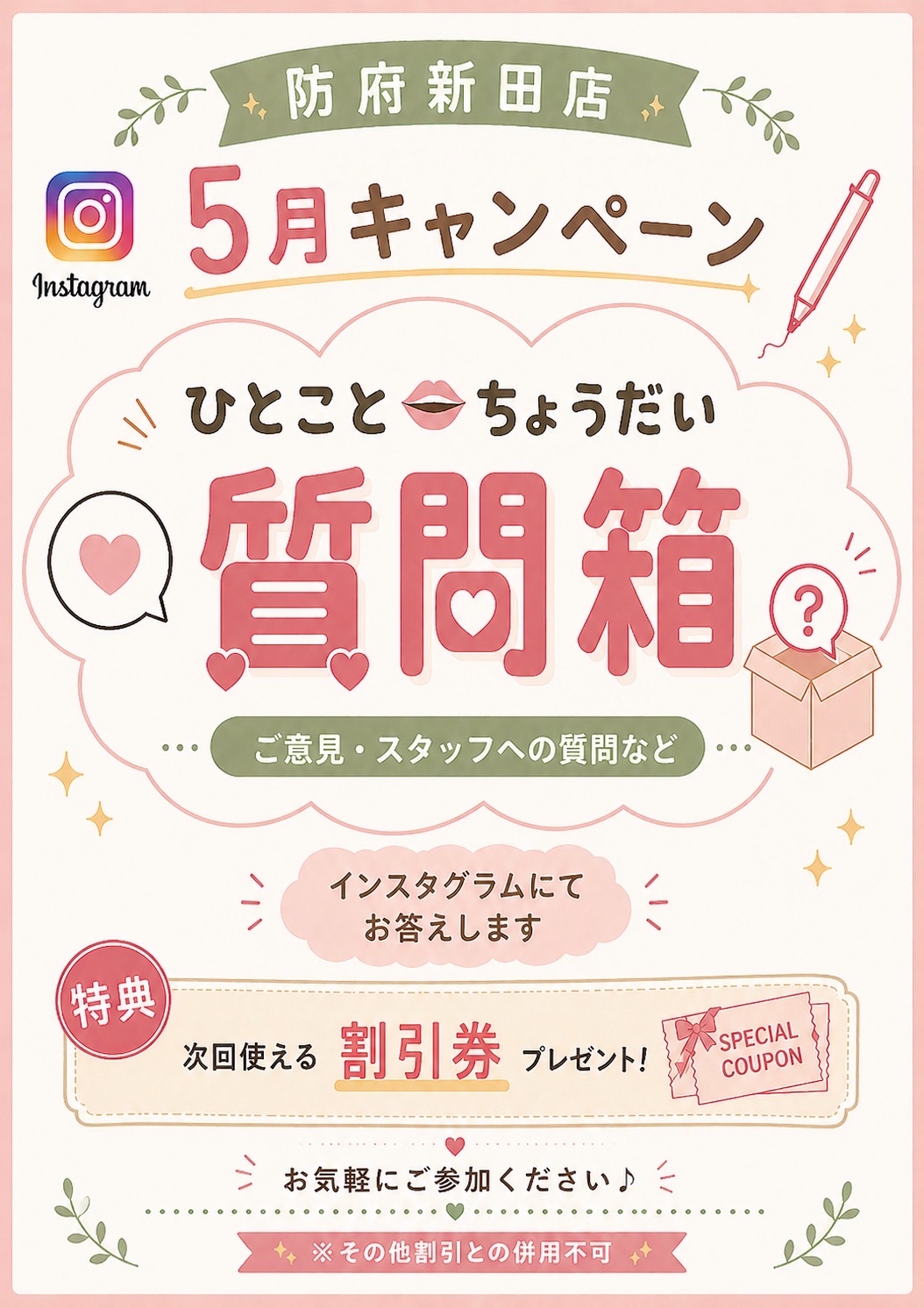 「ひとこと」を書いて下さった方には、特典として次回使える割引券をお渡しします🌺