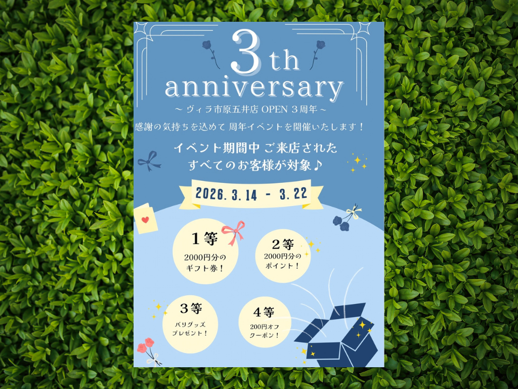 さてVilla市原五井店は3月21日に3周年を迎えることができます。