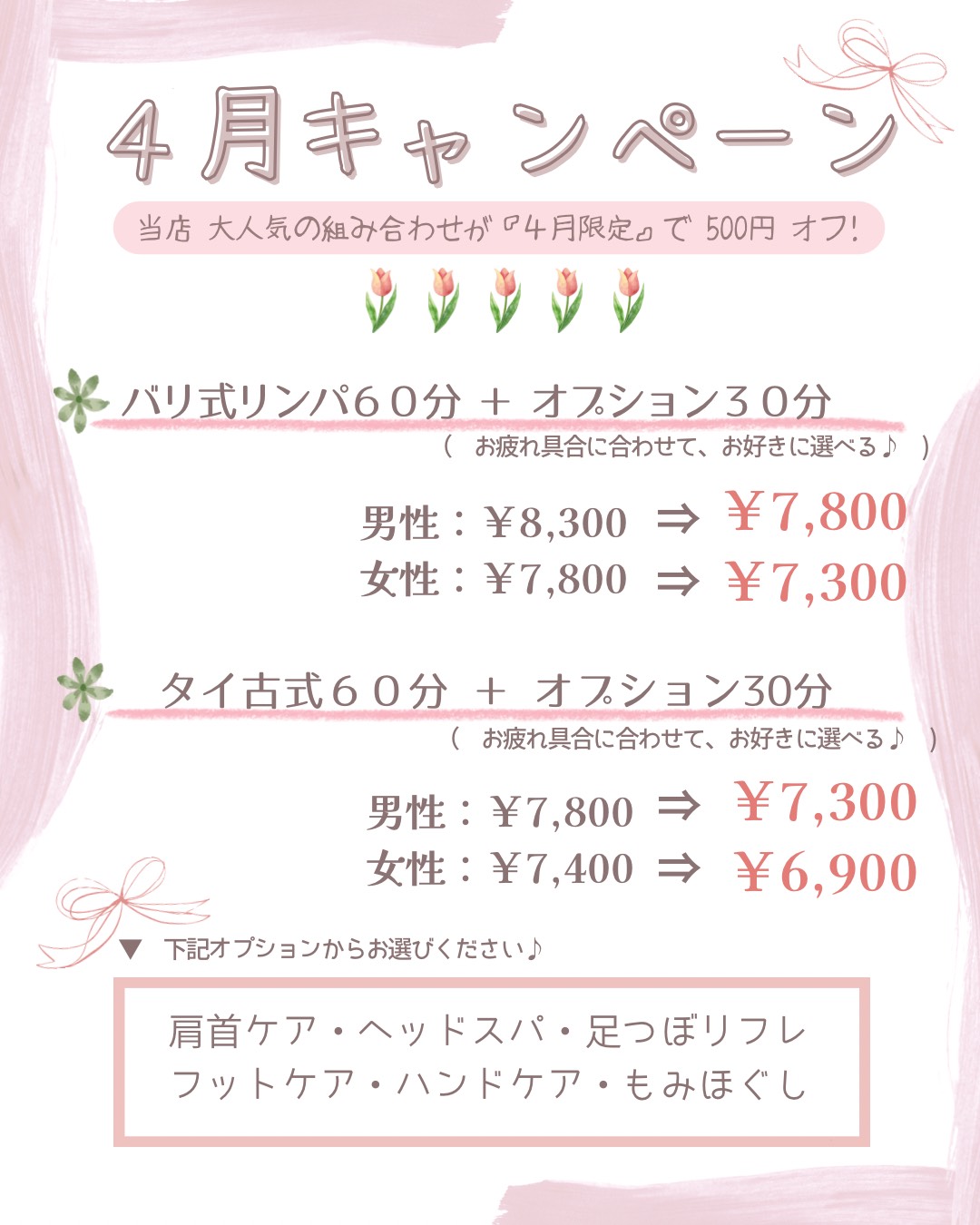 🌸4月はちょっと気分を変えて、“もみほぐし以外”も気軽に試していただけるキャンペーンをご用意いたしました☺️