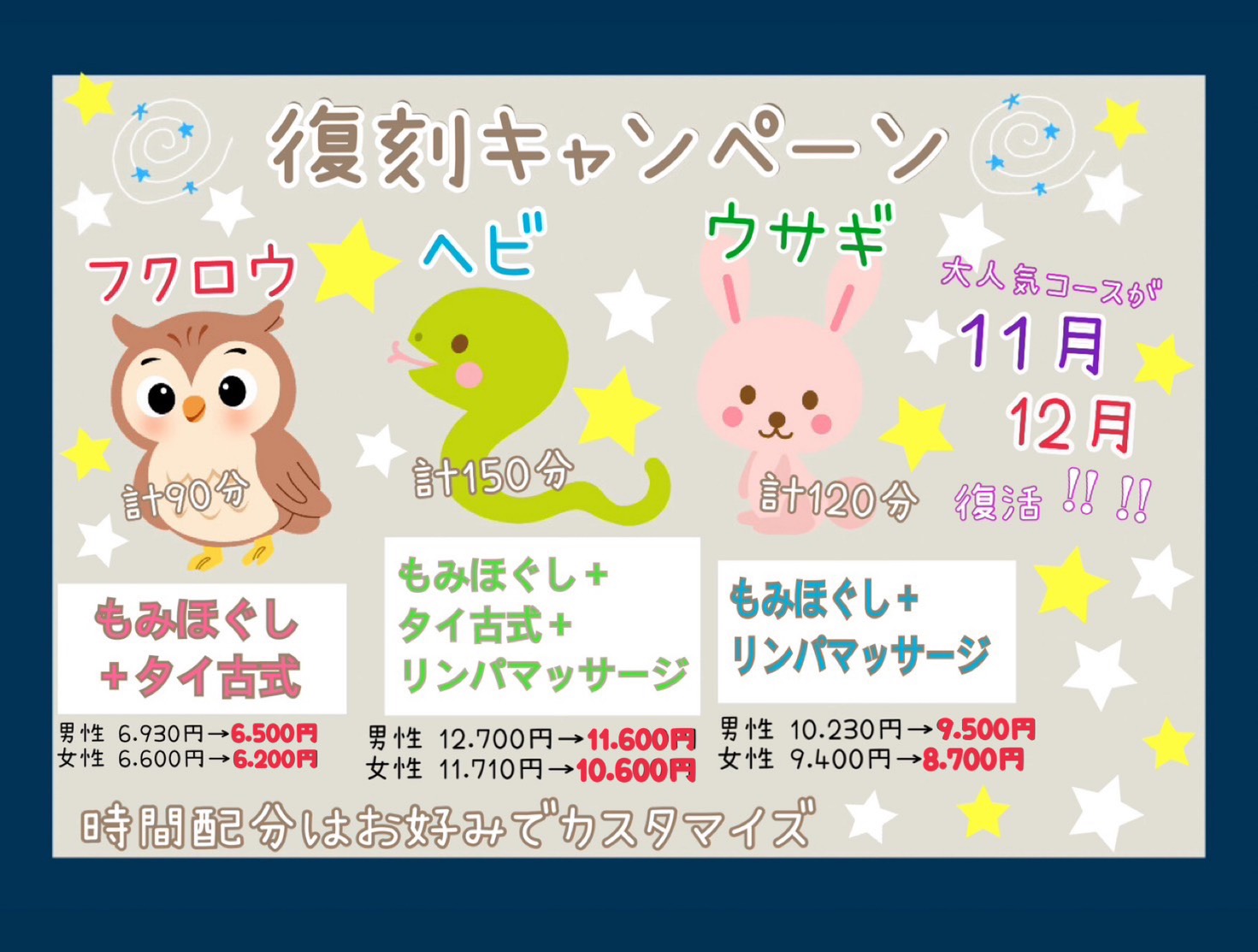 Ex.)コース ほぐ20分+タイ70分 計90分の中で自由に時間配分できます!
