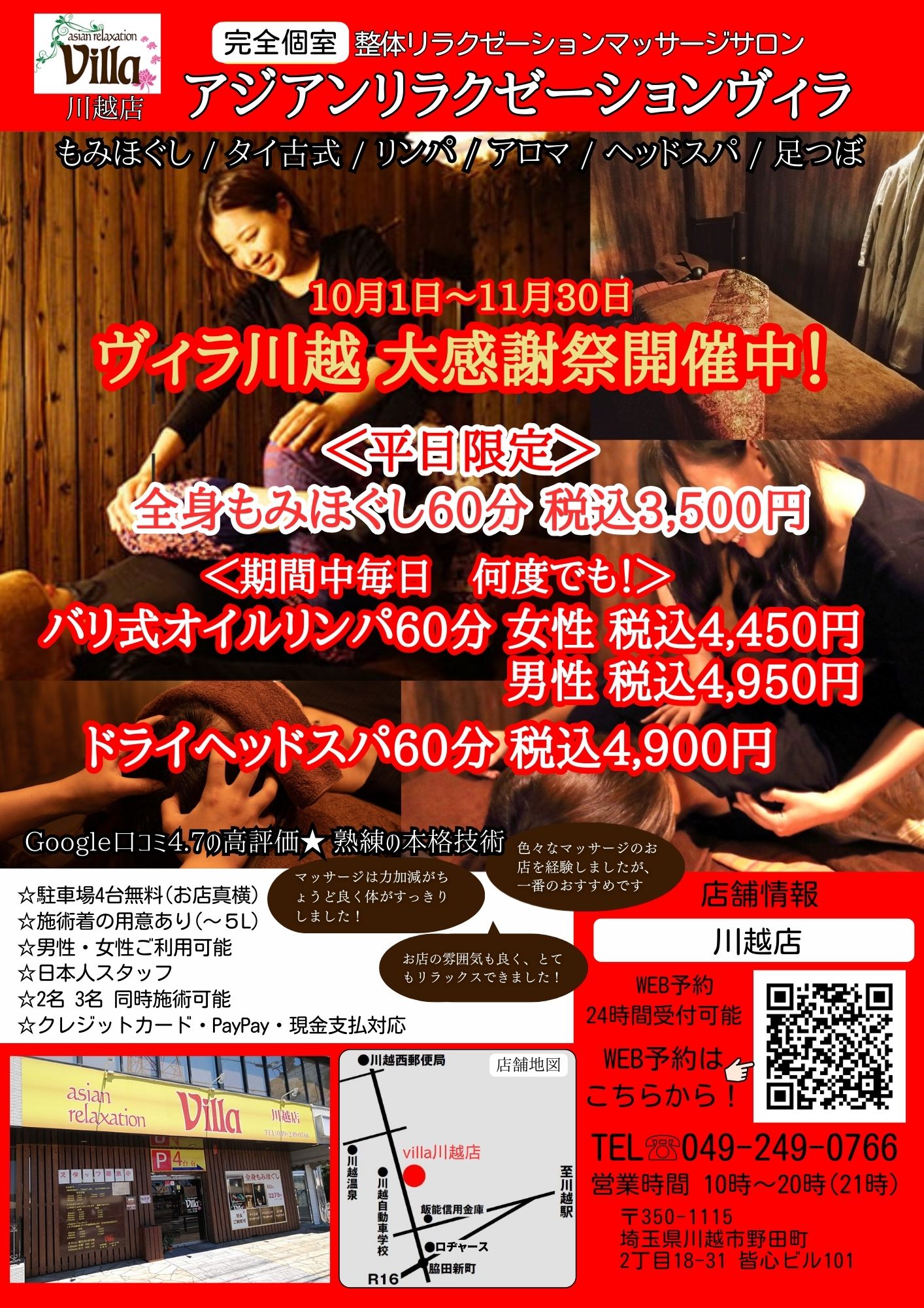 10月、11月でvilla川越店 大感謝祭キャンペーンを開催致します!!