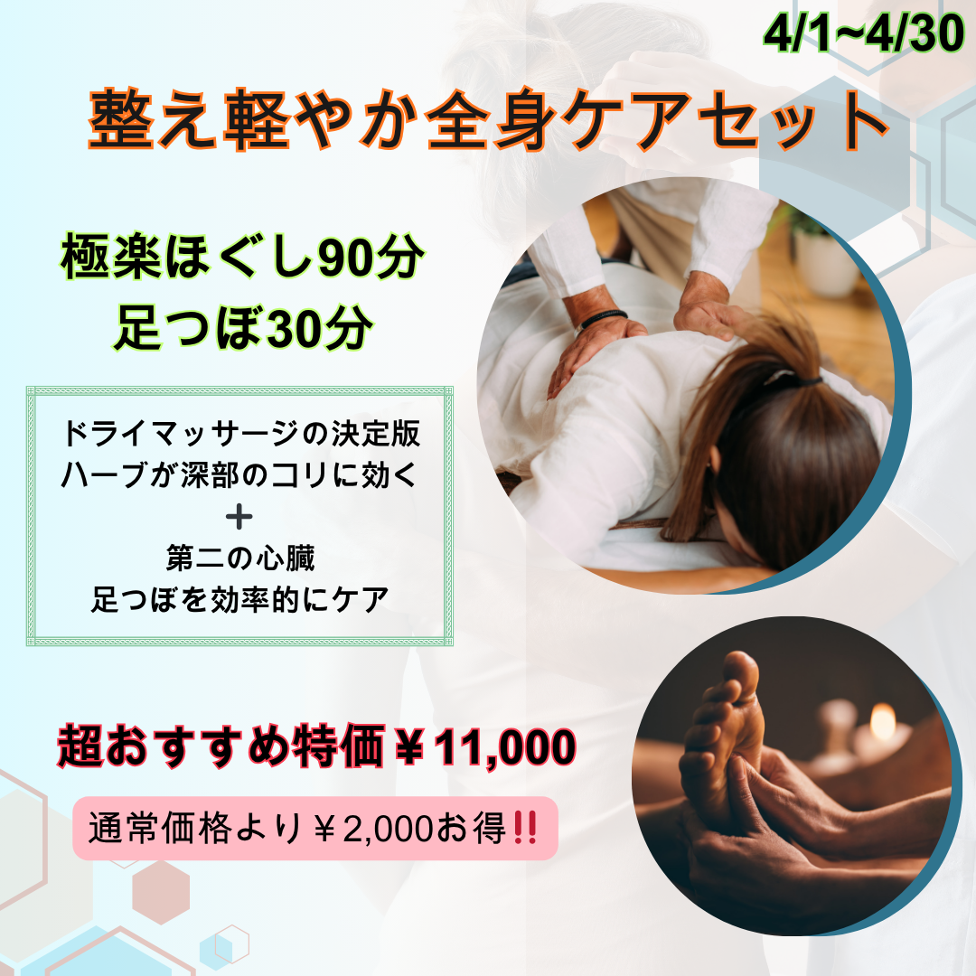 4月特価キャンペーン【整え軽やか全身ケアセット】極楽ほぐし90分+足つぼ30分🌺