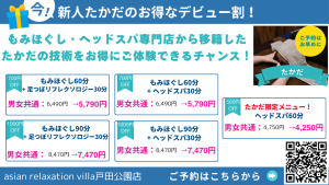 当面はもみほぐし、ヘッドスパ、足つぼリフレクソロジーのみ対応可です!