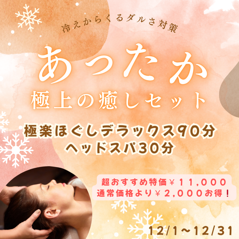 12月特価キャンペーン【極上の癒しセット】極楽ほぐしデラックス90分+ヘッドスパ30分🌺