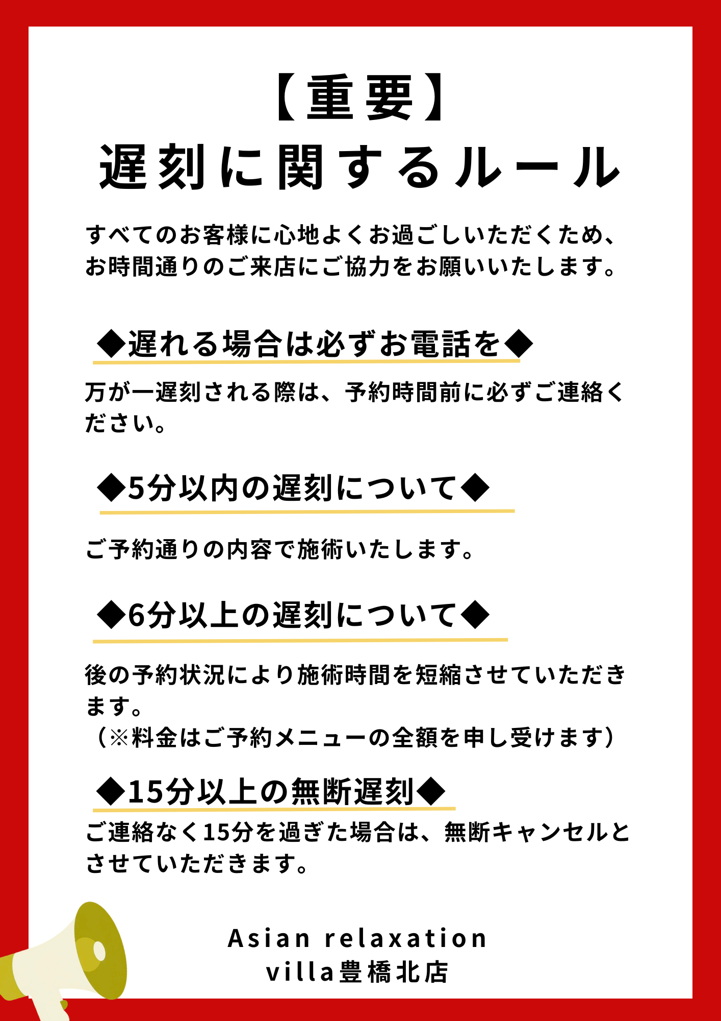 すべてのお客様に質の高い施術とスムーズなご案内を提供するため 、 遅刻に関するルールを以下の通り定めさせていただいております。