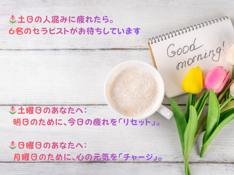 【4/18-19】土日の人混みに疲れたら。6名のセラピストがお待ちしています。