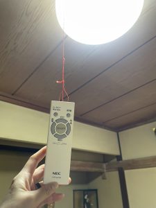 お家に行くと、なぜか「電気のリモコン」が、天井の電気を点けるための紐に、